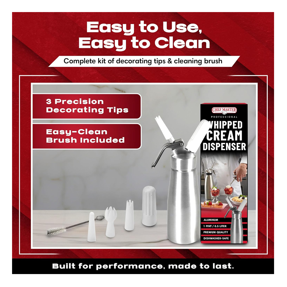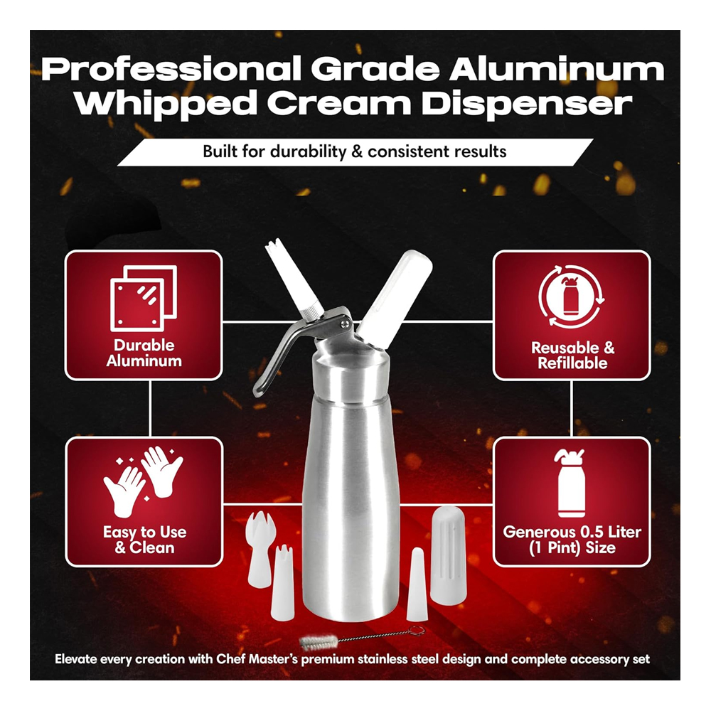Enjoy fresh, restaurant quality whipped cream at home or in professional kitchens with the Chef Master 90076 Professional Whipped Cream Dispenser. Designed with durable aluminum construction and compatible with standard 8g N₂O whipped cream chargers, this dispenser quickly transforms cream into light, fluffy whipped cream for desserts, beverages, and gourmet dishes.