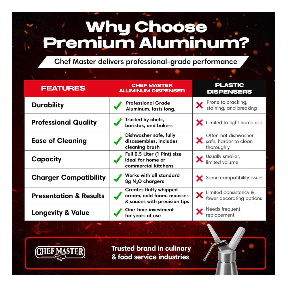 The Chef Master whipped cream dispenser is comprised from durable, food grade aluminum, designed for reliable performance in busy kitchens. The lightweight yet sturdy design provides long term durability while maintaining easy handling during service.