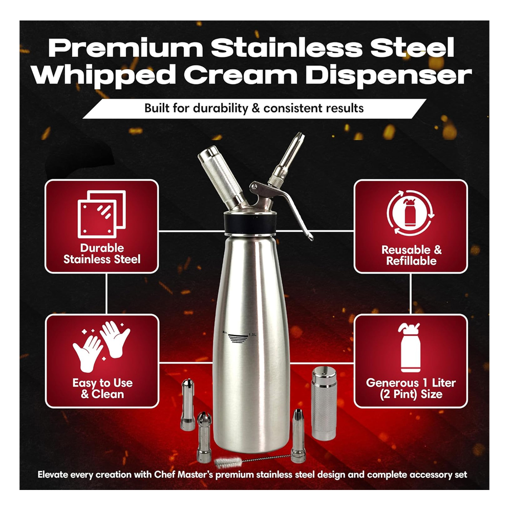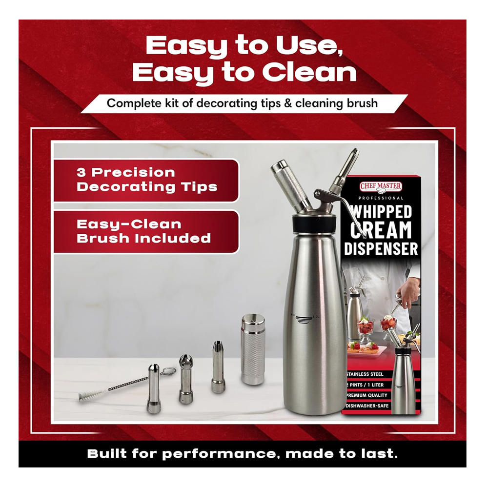 Prepare fresh, smooth whipped cream with the Chef Master 90079 Stainless Steel Whipped Cream Dispenser. Built from durable stainless steel and designed for use with standard 8g N₂O whipped cream chargers, this dispenser quickly produces light, airy whipped cream for desserts, beverages, and gourmet toppings.