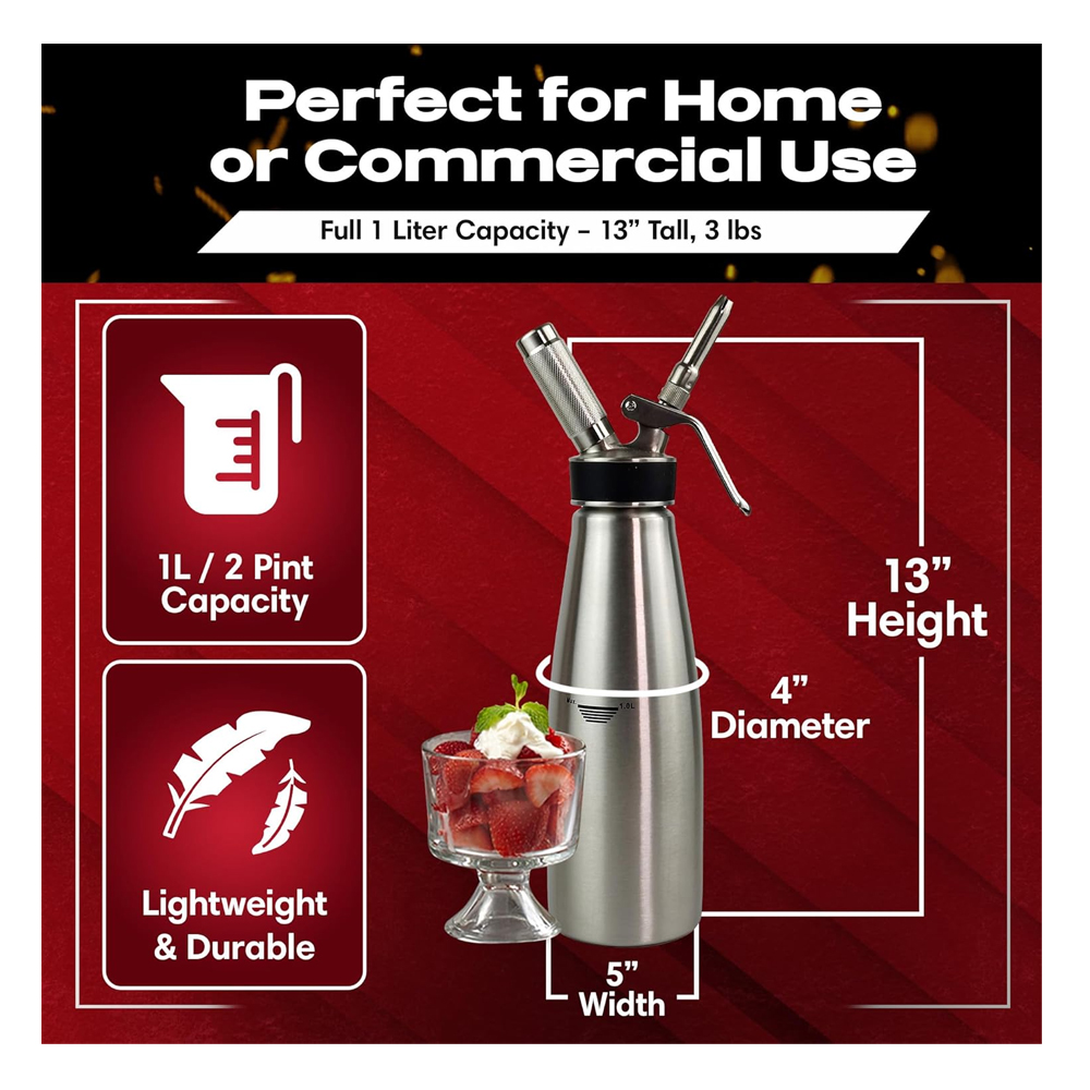 The Chef Master whipped cream dispenser is constructed from high quality stainless steel, designed for dependable use in both commercial kitchens and home environments. The stainless steel body offers excellent durability, corrosion resistance, and long lasting performance while maintaining a clean, professional appearance.