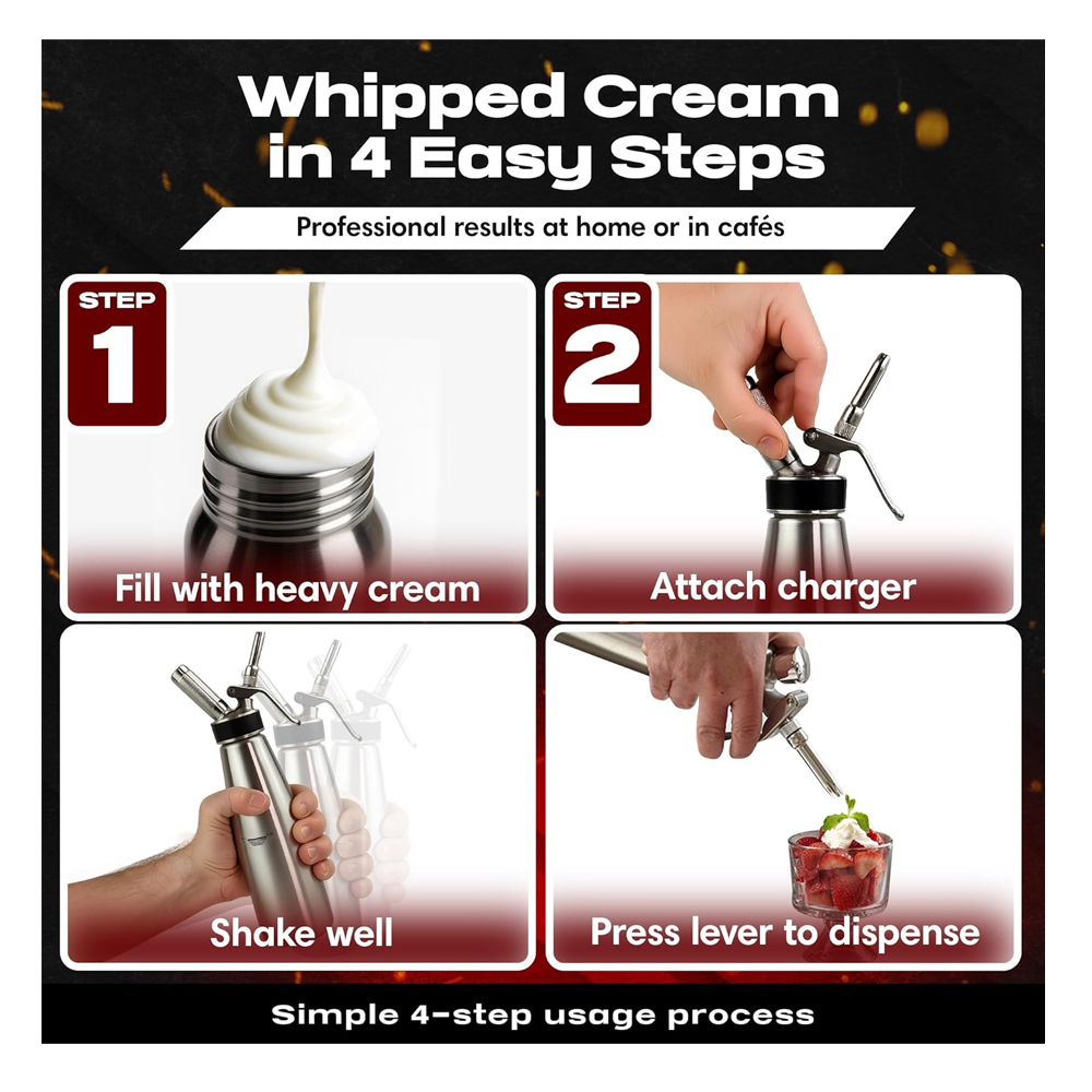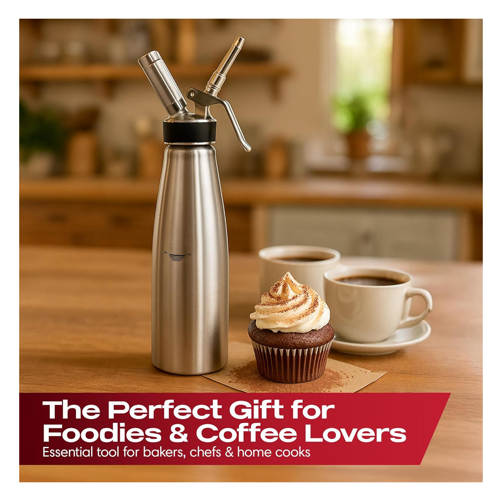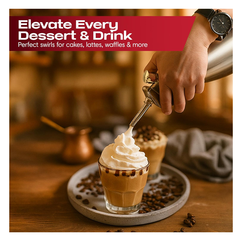 The dispenser includes three stainless steel decorating tips designed to create elegant whipped cream designs for desserts and beverages. A charger holder ensures secure charger installation, and a cleaning brush is included to simplify cleaning and maintenance.